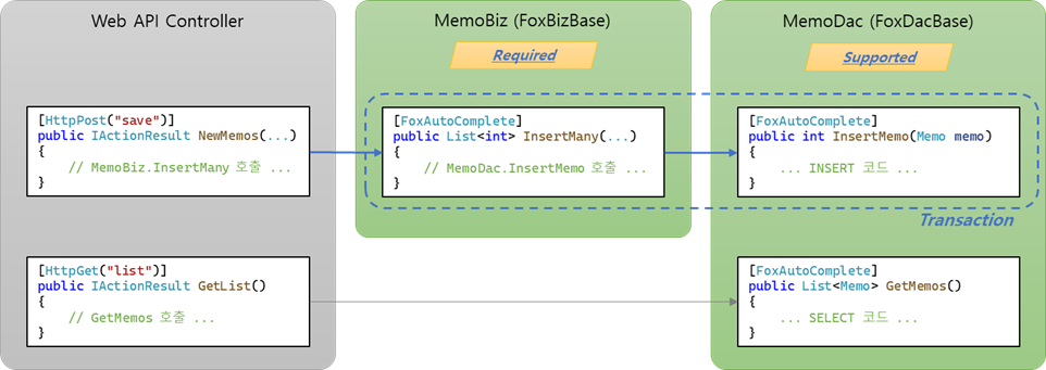 클라이언트 호출을 받은 Web API 는 Required 옵션을 사용하는 비즈니스 로직 메서드를 호출하며 비즈니스 로직 메서드는 Supported 옵션을 사용하는 DAC 메서드를 호출합니다. 이 과정에서 트랜잭션은 자동으로 시작되고 예외 발생 여부에 따라 커밋/롤백이 결정됩니다. 트랜잭션이 필요없는 단순 조회는 비즈니스 로직을 사용하지 않고 곧바로 DAC 메서드를 호출하여 성능을 고려하는 것이 권장됩니다.